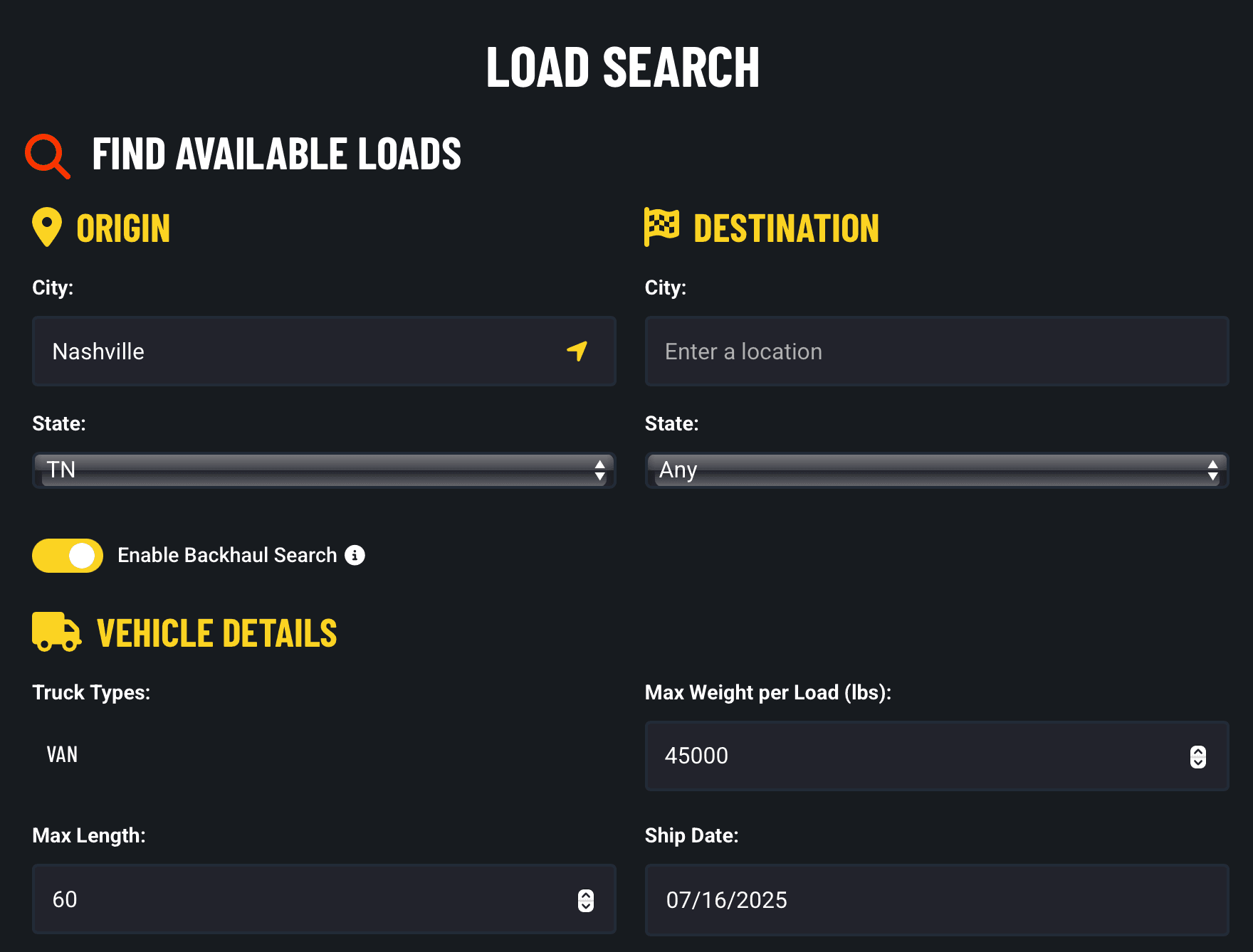 Here’s where you tell the system where you want your load to start and end. Example: you’re looking for a load that starts near Nashville. Simply set Nashville as the origin city and the load search will find all loads leaving Nashville. If you have a destination in mind, you can set that city as the destination and the load search will find all loads from Nashville to that particular location.